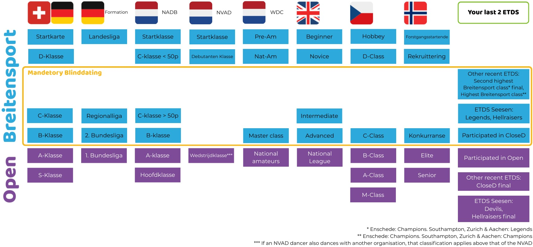 Pour le ClOpen, il y aura un système de tirage au sort au lieu du blind dating. Ce tirage détermine pour chaque tour et pour chaque danse avec quel(le) partenaire vous danserez. Sur la base de plusieurs tours de qualification, le ClOpen sera divisé en 2 classes au total :